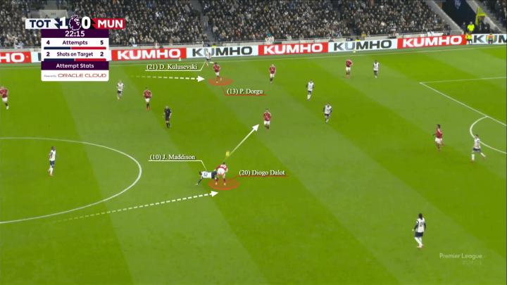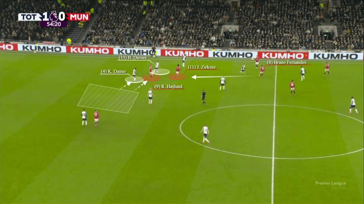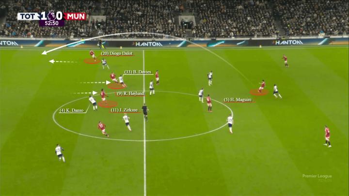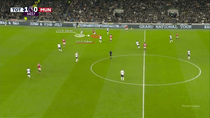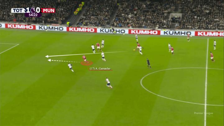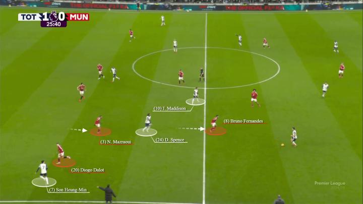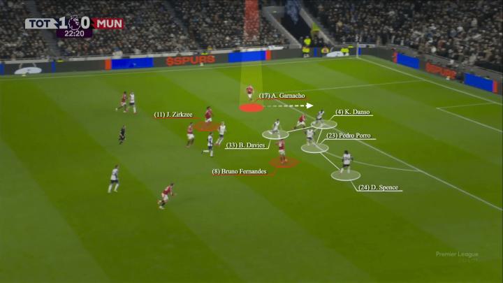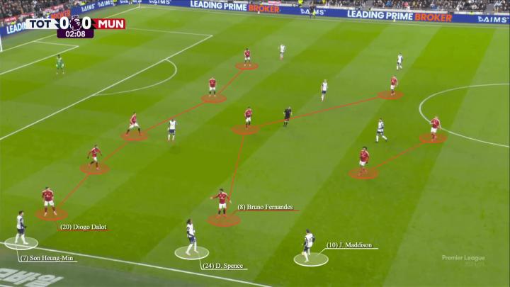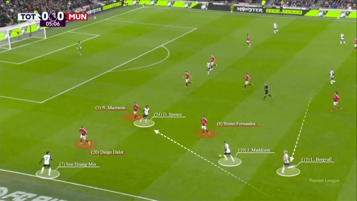 在上半场的比赛中,热刺利用人数优势在中场控制了比赛的节奏。他们不断地制造出传球选择,从而给曼联制造了压力。曼联在防守端显得犹豫不决,无法有效地切断热刺的进攻线路。这让热刺有机会在比赛中占据优势。